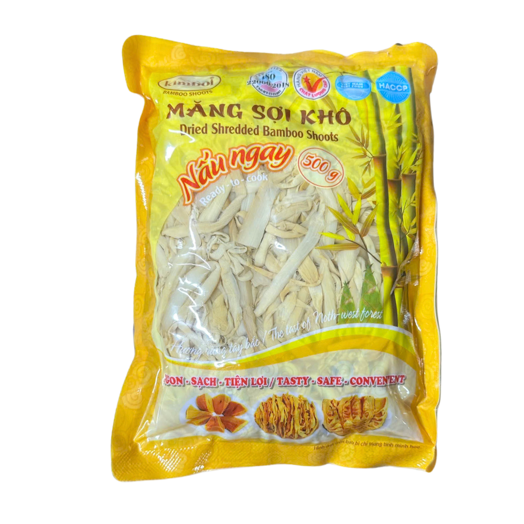 Dried bamboo shoots are a specialty of the Northwest mountains, selected from fresh and delicious bamboo shoots. Bamboo shoots are processed into small fibers, dried directly in the sun and do not contain any chemicals or colorants. The bamboo shoot color is completely natural, so when eaten, the bamboo shoots have a moderate toughness. The product is manufactured by Kim Boi Joint Stock Company using modern technology. All processes from raw material selection to processing and packaging strictly comply with food hygiene and safety regulations, ensuring that consumers receive clean, high-quality products. Bamboo shoots are known to be a popular food in life. With very low fat and sugar content and rich in fiber, bamboo shoots are a food that promotes intestinal motility, aids digestion, and effectively prevents obesity, atherosclerosis, and high blood pressure. According to research documents, every 100g of bamboo shoots contains 4.1g of protein (protein contained in bamboo shoots has up to 16 types of amino acids), 0.1g of lipid, 5.7g of glucid, 22mg of calcium, 56mg of phosphorus, 0.1g of iron, 0.08mg of carotene, 0.08mg of vitamin B1, 0.08mg of vitamin B2, 0.6mg of vitamin B3, 1mg of vitamin C