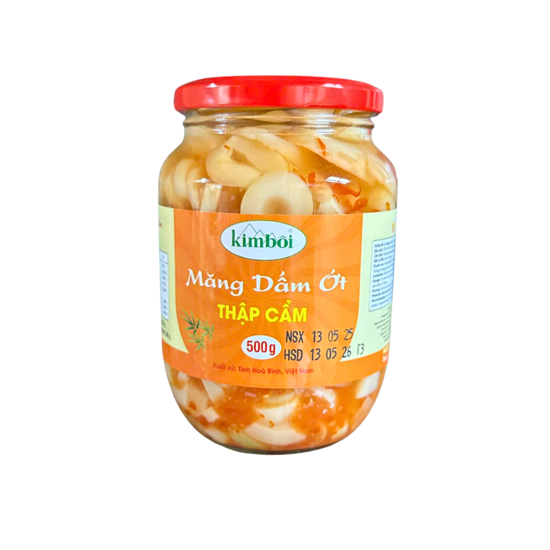 Măng Dấm Ớt Thập Cẩm được sản xuất bởi Công ty CP Nông sản Kim Bôi theo công nghệ hiện đại. Mọi quy trình từ khâu chọn nguyên liệu tới khâu chế biến và đóng gói đều tuân thủ nghiêm ngặt quy định về vệ sinh an toàn thực phẩm, đảm bảo mang đến tay người tiêu dùng sản phẩm sạch, chất lượng cao. Măng được chọn lựa kỹ lưỡng trước khi đưa vào sản xuất, vị ngọt thanh tự nhiên của măng kết hợp với vị cay của ớt, chua của dấm, hoà quyện với nhau mang lại một hương vị tinh tế và đậm chất miền núi Tây Bắc Việt Nam.